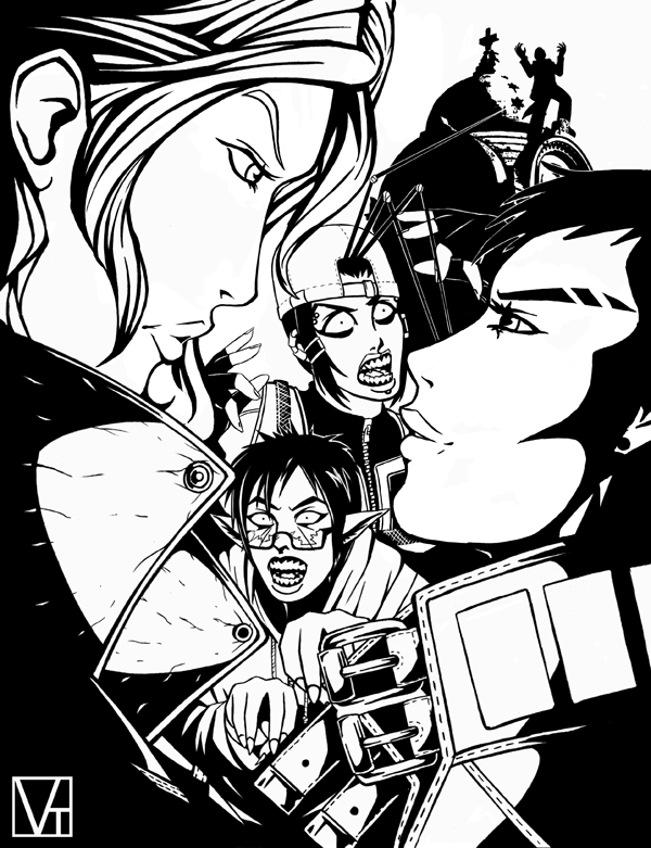 Shadoboxxer VS Rellik: this is a black and white of Fem Rellik, Fem Shado, Zombie Kim, and Zombie Del